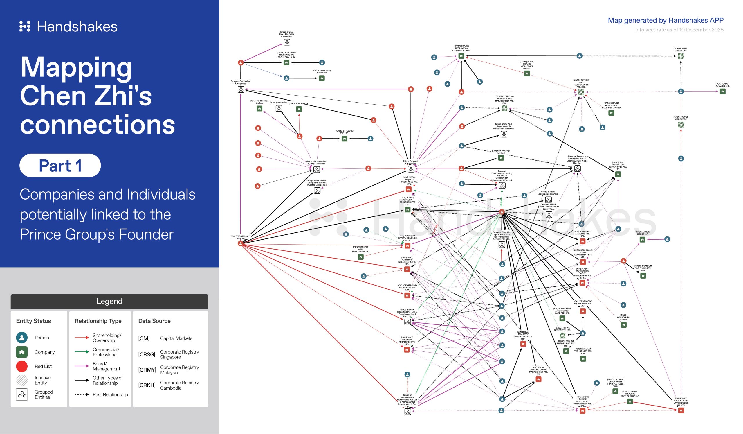 Based on Handshakes’ mapping tool, it was observed that several companies directly linked to Chen Zhi are unsanctioned to date. The map also indicates that a number of Chen Zhi’s associates in Cambodia — connected to Prince Group and related businesses — maintain corporate footprints in Singapore and Malaysia, including individuals not previously named in media reporting. In Singapore, these connections extend separation and include potential links into listed-company environments, illustrating how networked exposure can persist beyond what headline enforcement actions alone make visible. You can download the full map by signing up today.