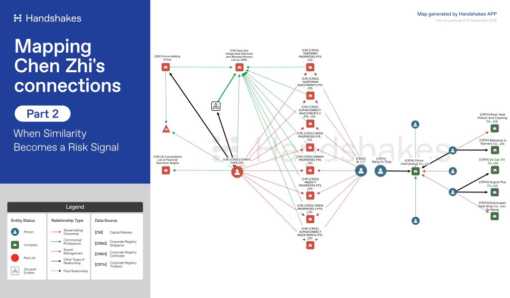 Based on Handshakes’ mapping tool, it was observed that several companies directly linked to Chen Zhi are unsanctioned to date. The map also indicates that a number of Chen Zhi’s associates in Cambodia — connected to Prince Group and related businesses — maintain corporate footprints in Singapore and Malaysia, including individuals not previously named in media reporting. In Singapore, these connections extend separation and include potential links into listed-company environments, illustrating how networked exposure can persist beyond what headline enforcement actions alone make visible.