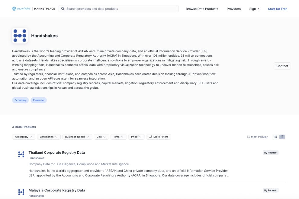 The Handshakes’ datasets on Snowflake features comprehensive company and financial data on private enterprises across Singapore, Malaysia, Thailand and Vietnam in Phase One of the release. As the world’s leading aggregator and provider of ASEAN and China private company data, Handshakes empowers businesses to expand their risk coverage, perform enhanced due diligence and drive smarter decision-making with its powerful network analysis tool. With this new listing, Snowflake users can directly access Handshakes’ curated datasets within their cloud environment, accelerating insights with scalable, secure and seamless data integration.